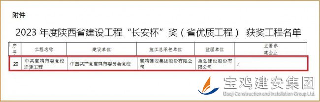 近日,陜西省住房和城鄉(xiāng)建設(shè)廳《關(guān)于公布2023年度陜西省建設(shè)工程長安杯獎(省優(yōu)質(zhì)工程)評選結(jié)果的通知》正式下發(fā),公司承建的中共寶雞市委黨校遷建工程榮登金榜,為集團再添一項陜西省建設(shè)工程“長安杯”獎。